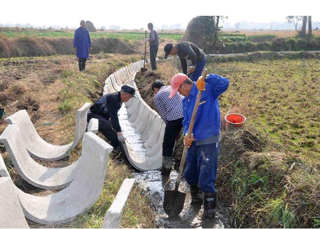 日前,枞阳县周潭镇彭桥村横涧片的村民正在农田里用液体混凝土浇灌安装抗旱引水沟渠槽。据了解,该项目建成后能解除该村横涧片近70公顷农田易旱难保丰收的忧患。