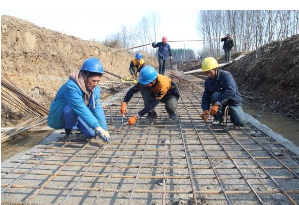 12月24日,在义安区天门镇新华村境内的顺安河朱村西河段河道治理工程现场,工人们正在河道直立挡墙底板上绑扎钢筋。